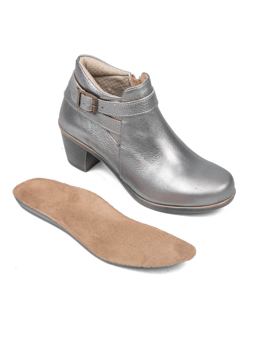 Botas de cuero flotter peltre marca Keady con hebilla y cierre lateral interno.
