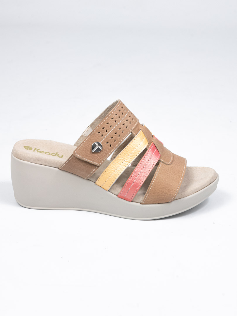 Zuecos marca Keady con tiras combinadas color camer, rojo amarillo que elevan cualquier look sin resignar comodidad.