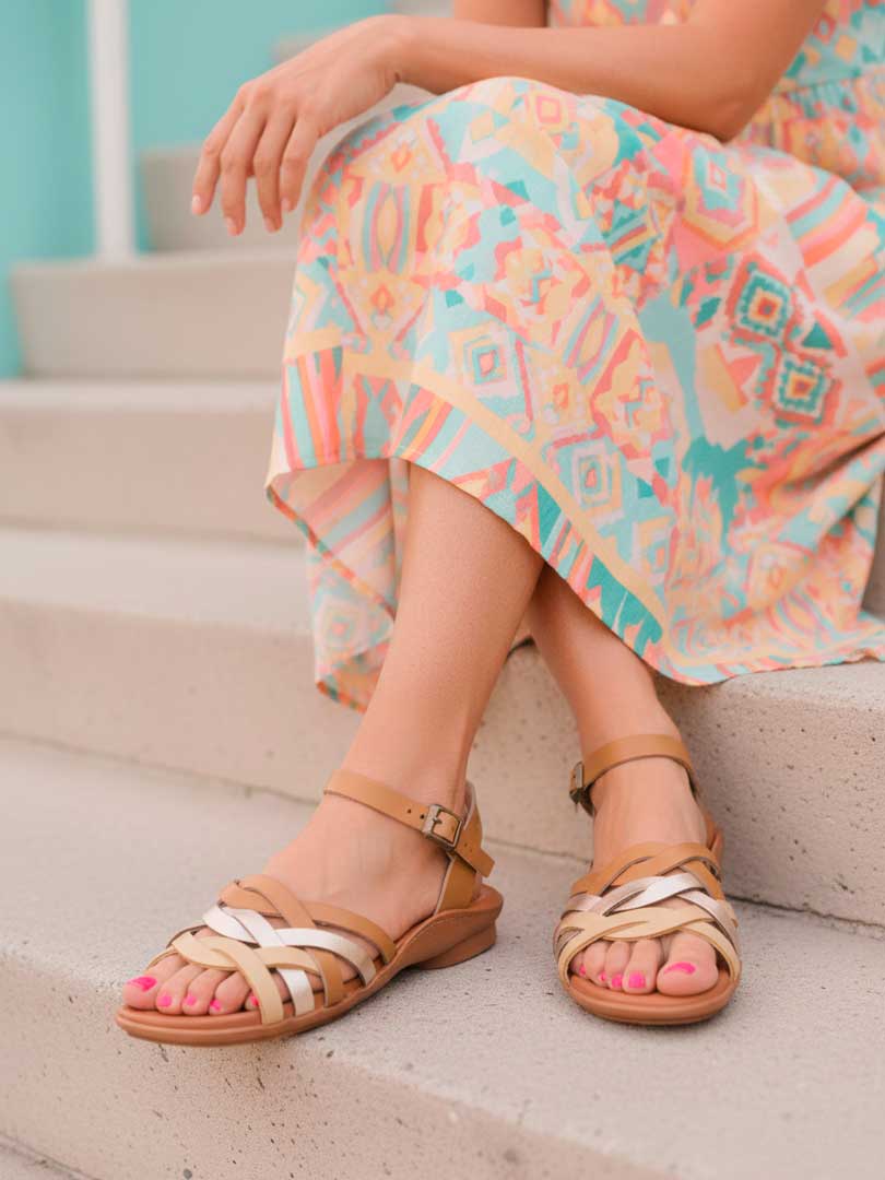 • Diseño cruzado: Sus tiras cruzadas en tonos ostra y beige