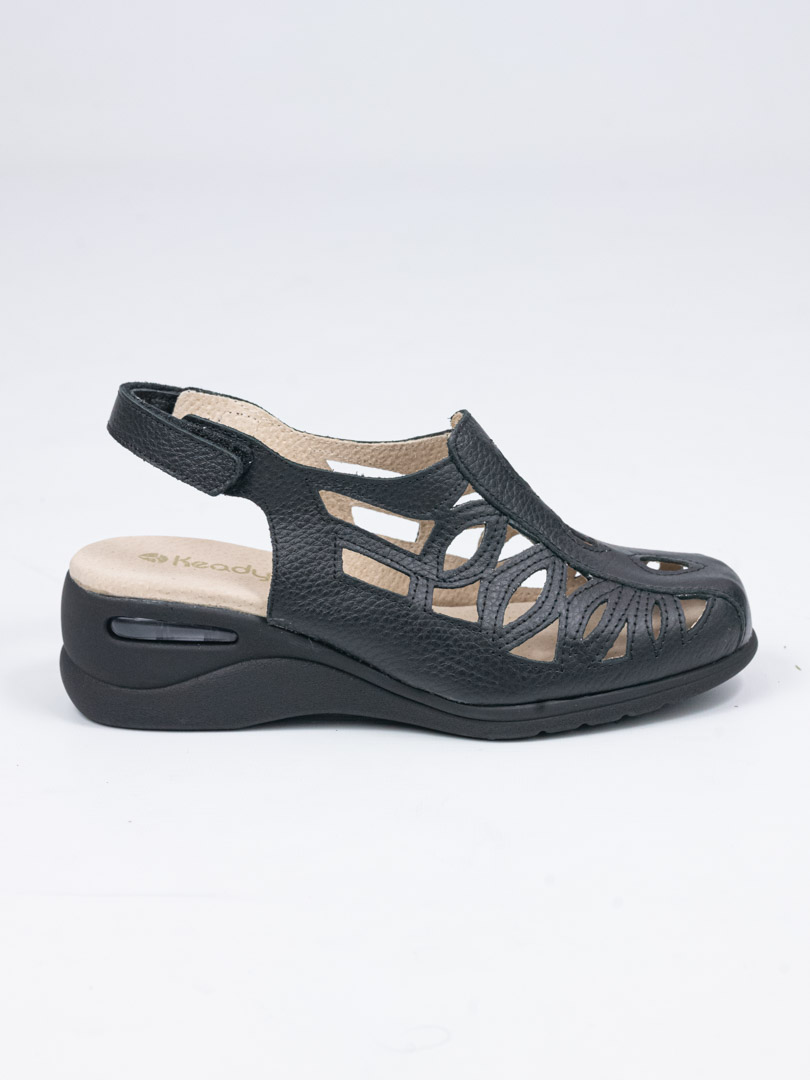 Estas urbanas Keady combinan un look elegante con la comodidad ideal para el uso diario. El cuero vacuno negro y el diseño calado las convierten en una opción clásica para los días cálidos, manteniendo el pie fresco y seguro.
