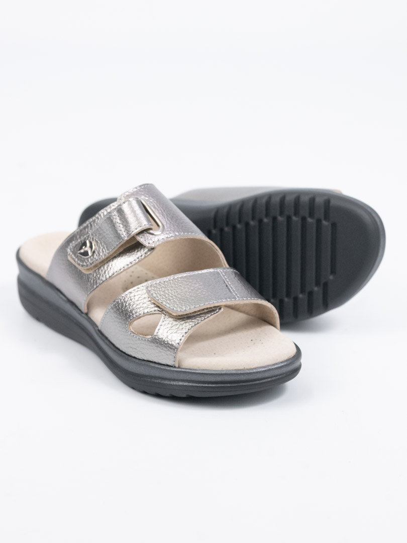 Capellada en cuero vacuno: cuero flotter peltre metalizado, blando y resistente para uso cotidiano.