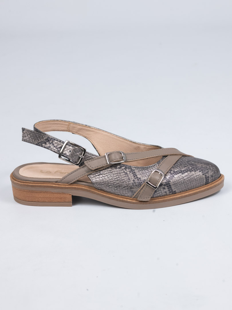 Elegancia urbana en cada paso: estas sandalias combinan cuero vacuno con terminación reptil y tiras cruzadas, ofreciendo un look sofisticado y actual que realza cualquier outfit.