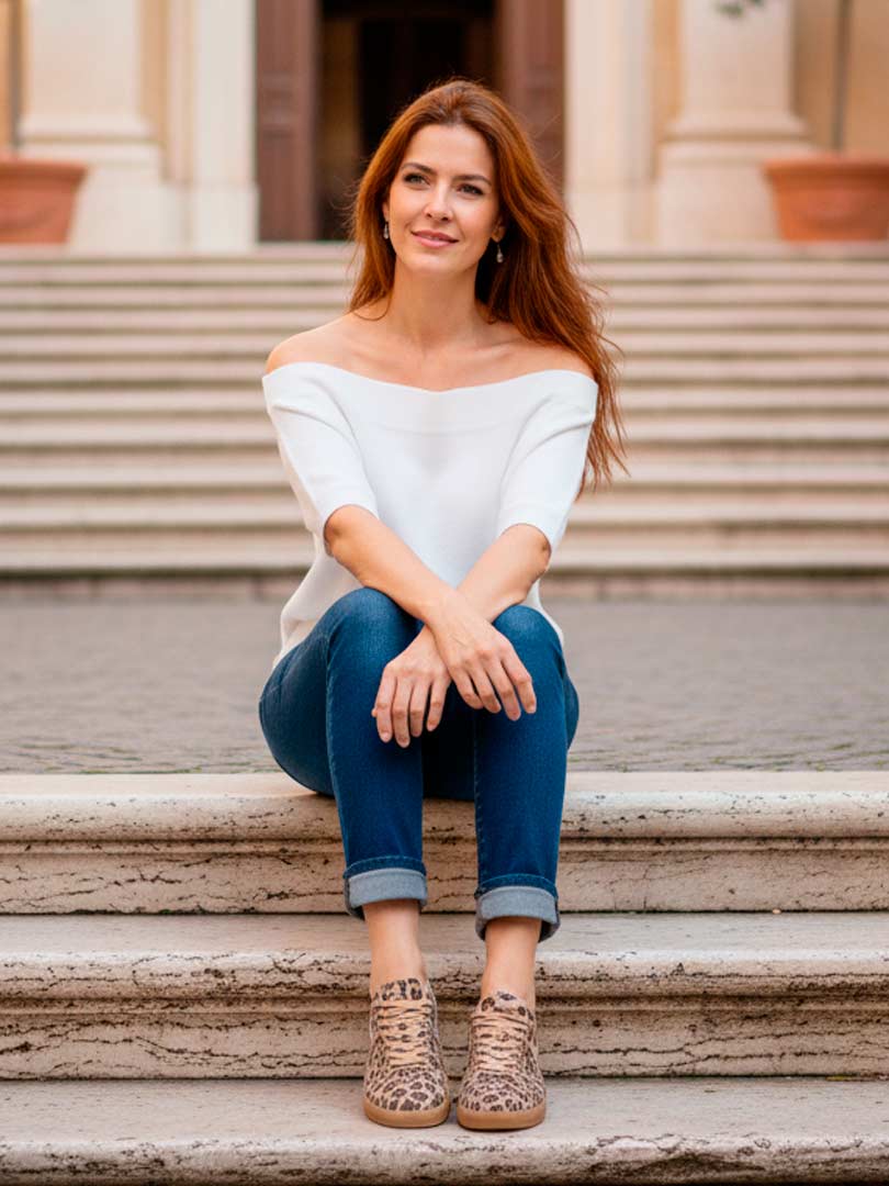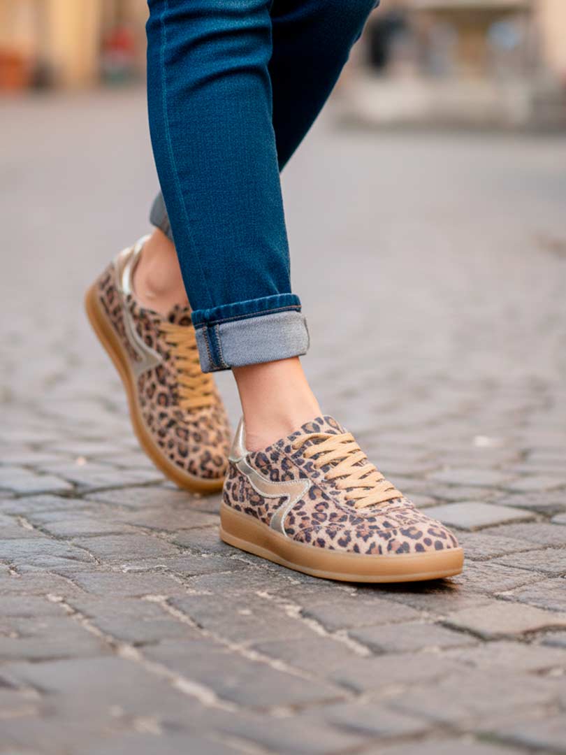Cuero vacuno: Confeccionadas en cuero con grabado animal print y detalle en platino.