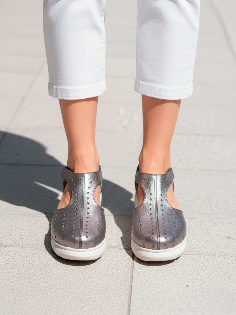 • Corte calado geométrico: favorece la ventilación del pie sin perder elegancia.