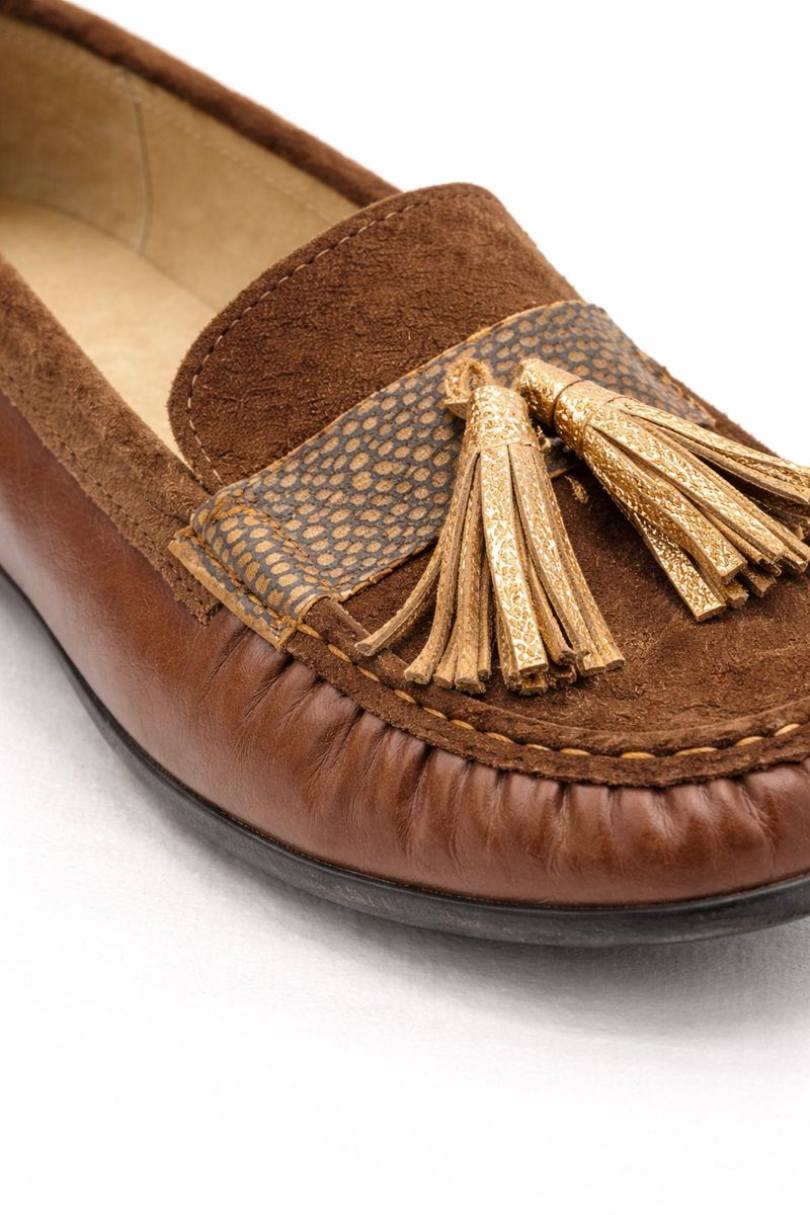 Confeccionado en cuero vacuno legítimo, combina base en tono cuero con detalles en gamuza y aplique frontal con flecos metalizados, aportando un estilo cálido, femenino y sofisticado.