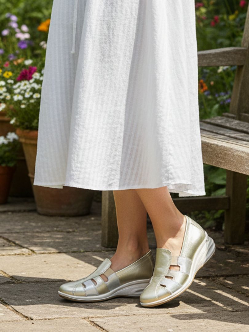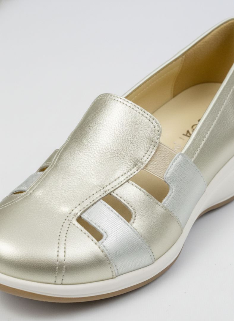 Cuero vacuno con acabado metalizado en tono platino, combinado con recortes frontales calados que aportan ventilación y un look moderno y liviano.
