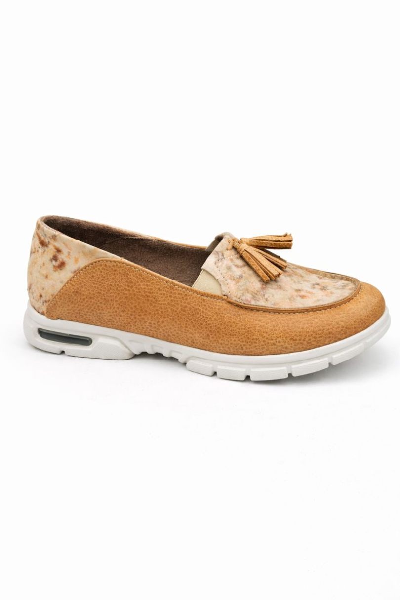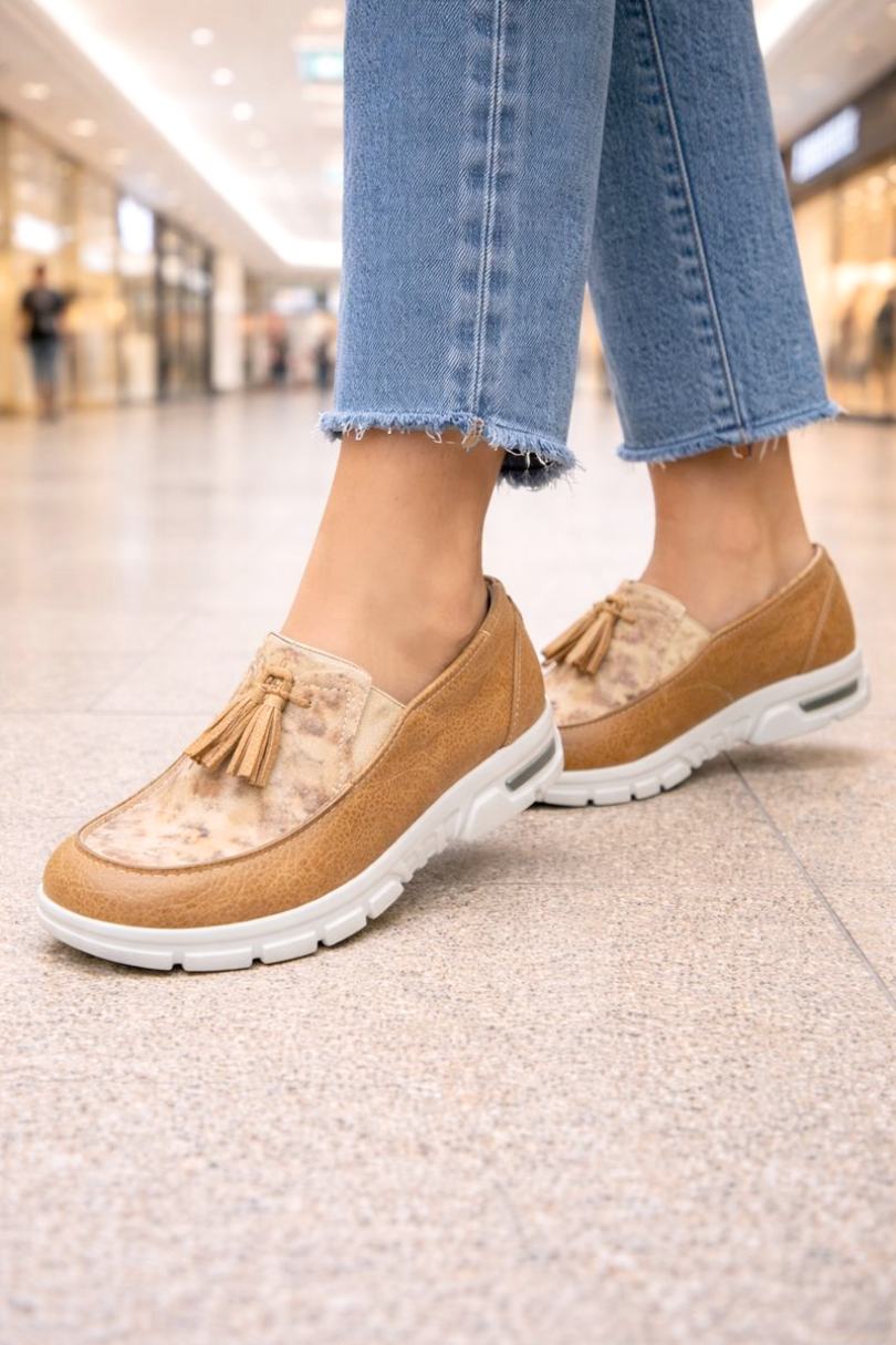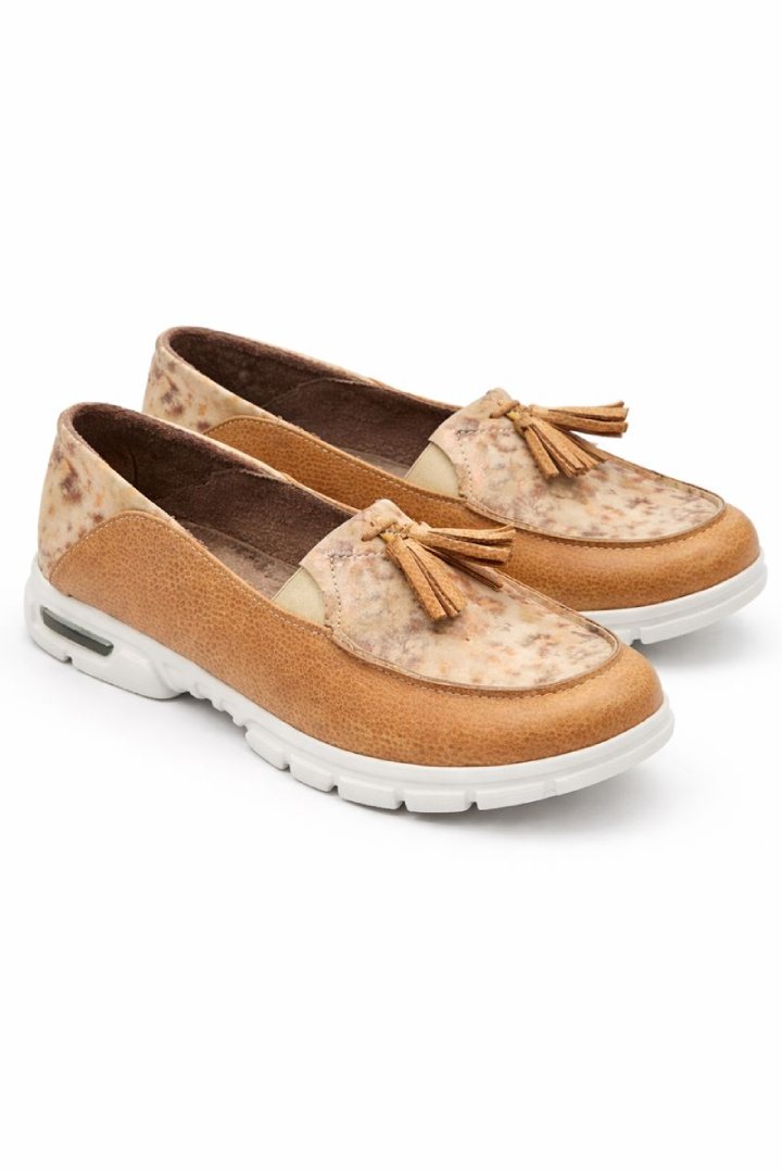 Realizada en cuero vacuno legítimo, combina base en tono suela con detalles estampados tipo marmolado en el empeine y delicado aplique de flecos, logrando un look cálido, original y muy fácil de combinar.