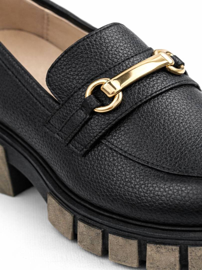 Cuero vacuno graneado en color negro con herraje metálico dorado en el empeine, que suma un detalle elegante y moderno.