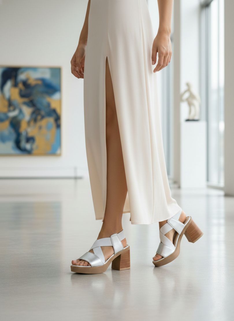 Sandalias Piscis Shoes de diseño elegante y femenino, con combinación de tonos neutros y detalles metalizados que aportan luminosidad y estilo sin resignar comodidad.