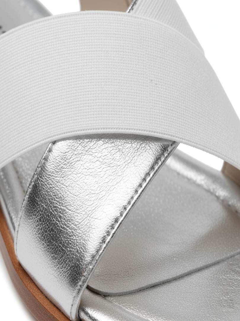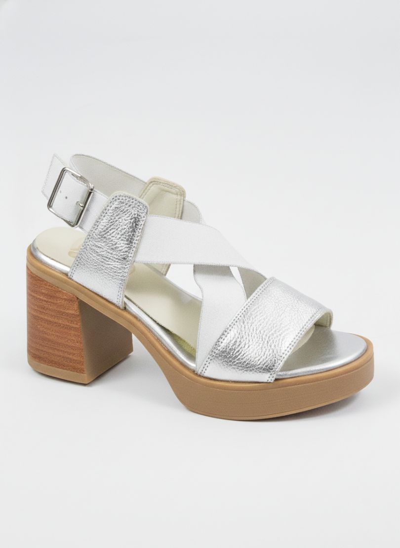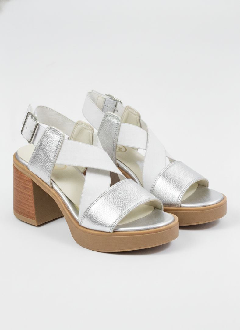 Cuero vacuno combinado en tonos claros con detalle metalizado en el empeine, que suma un toque sofisticado y moderno, fácil de integrar a distintos looks.