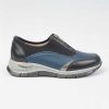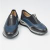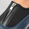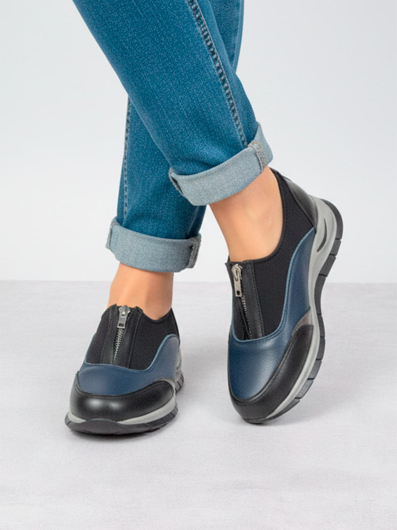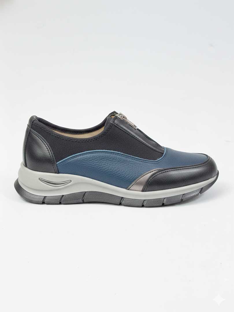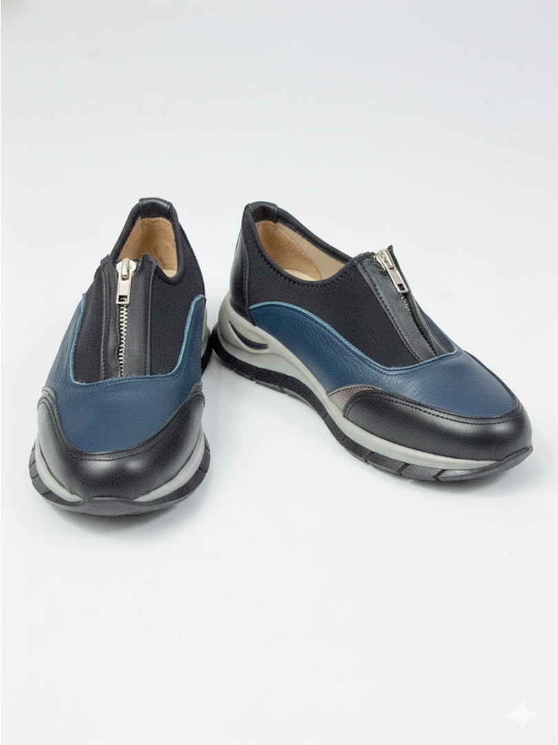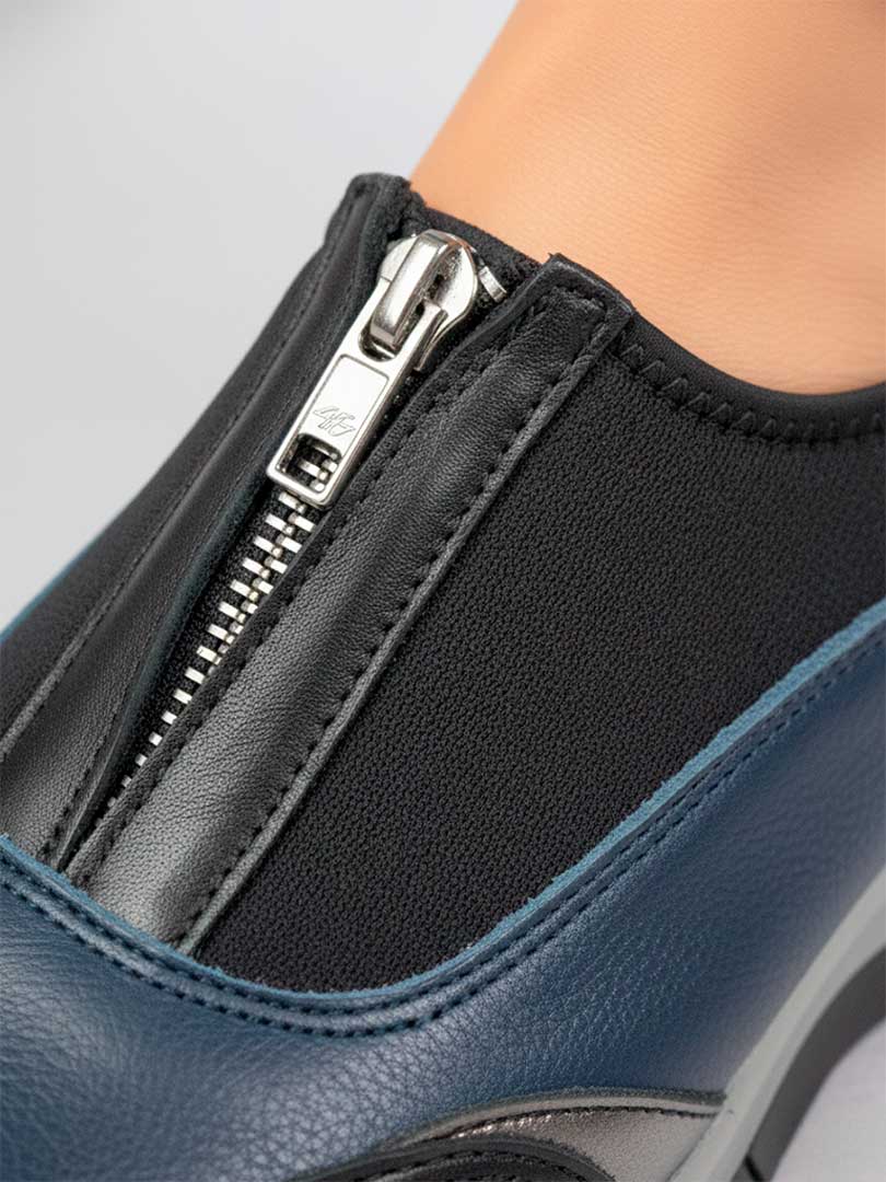 • Capellada combinada en cuero vacuno: combinan cueros negro, azuly y peltre. Aporta estructura, resistencia y un look dinámico en contraste de colores.