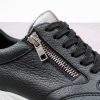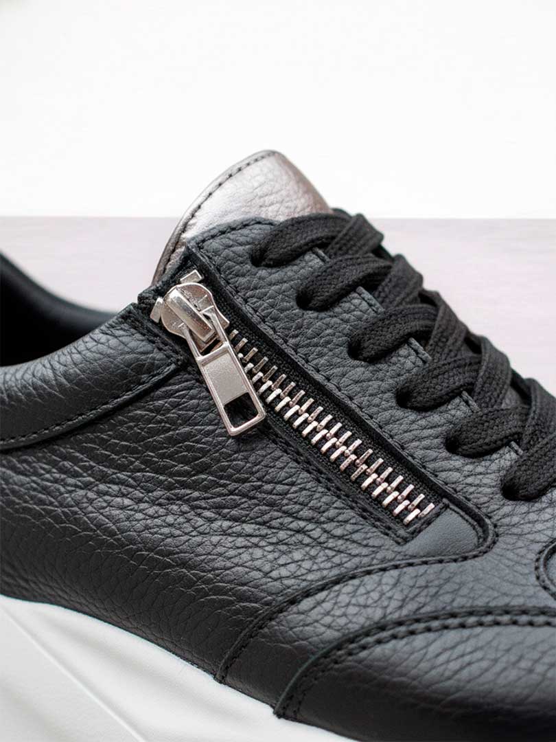 • Capellada en cuero vacuno: cuero flotter negro con detalle metalizado peltre: blando, flexible y de gran durabilidad.