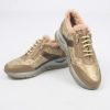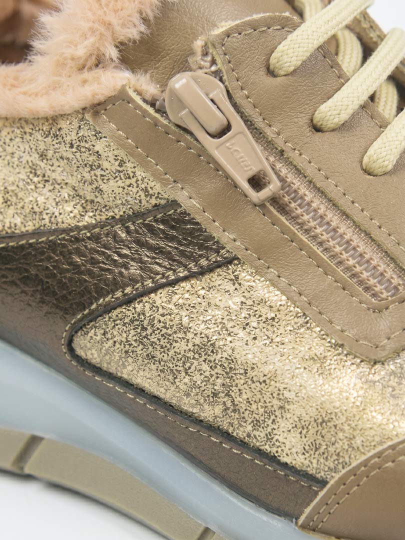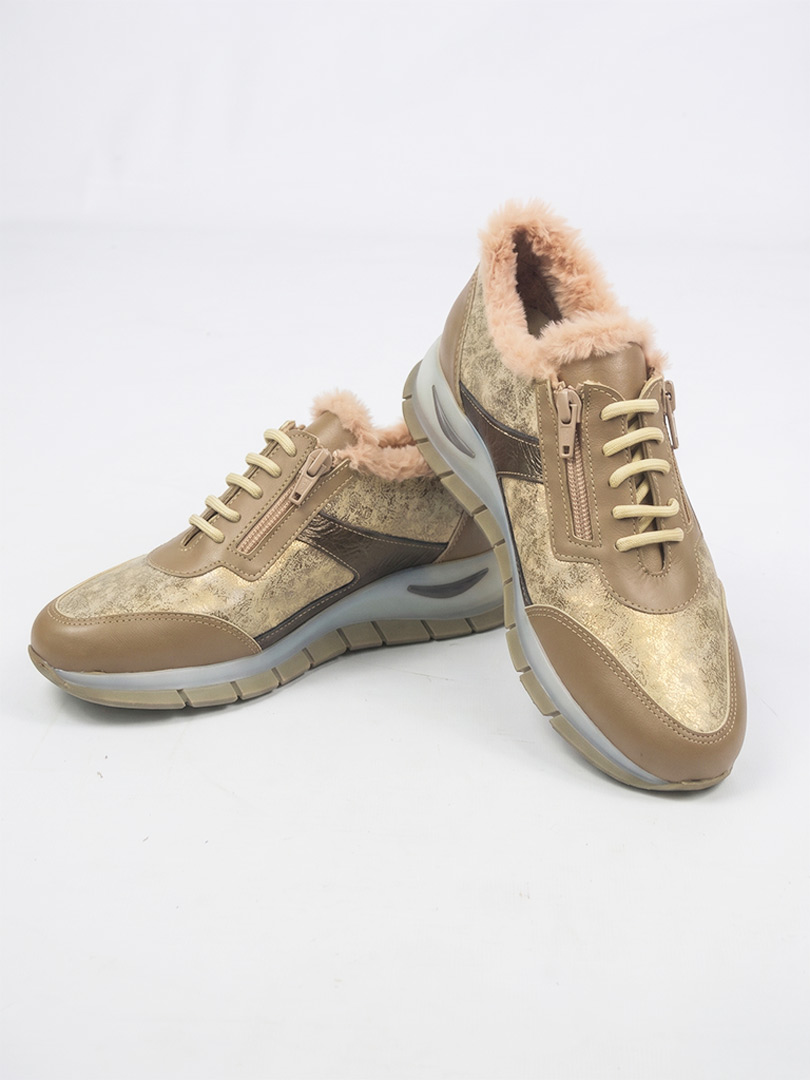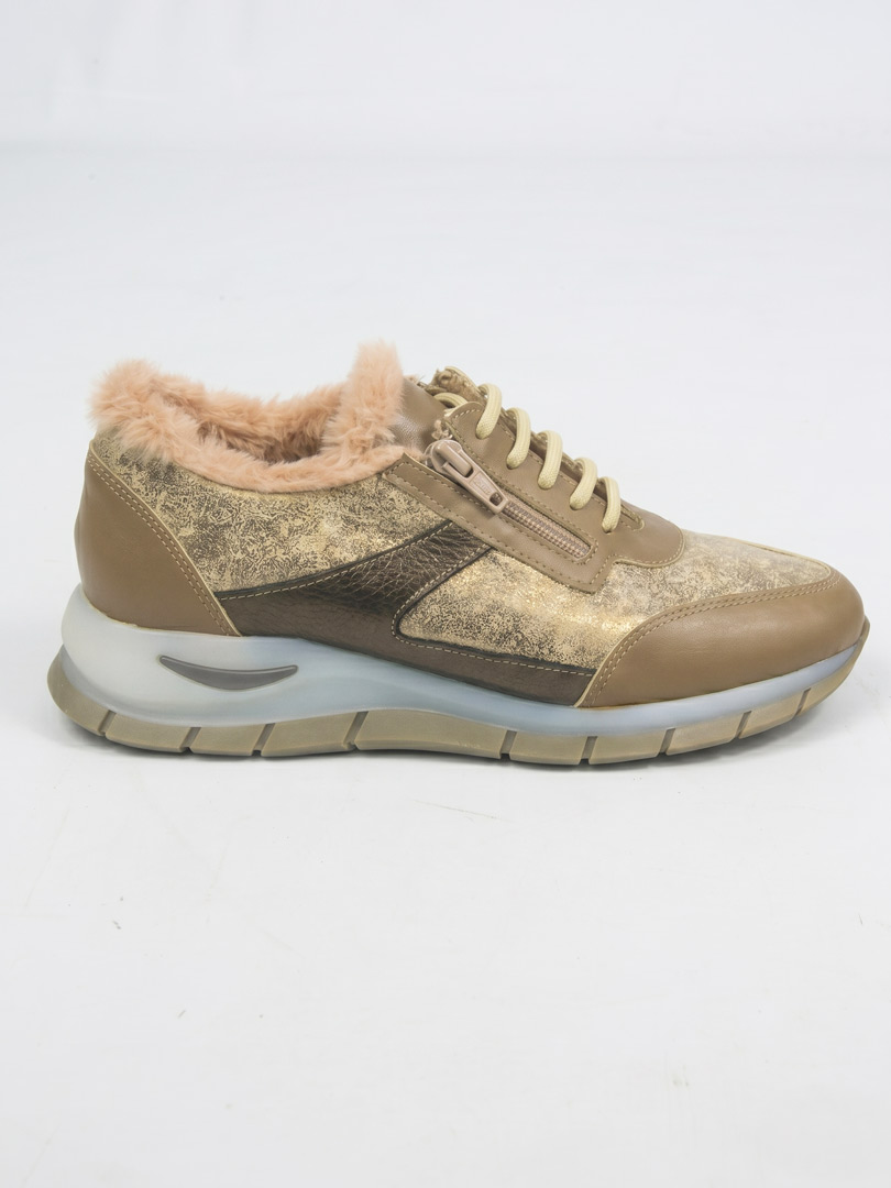 • Capellada en cuero vacuno: Combinación en tonos mancha hueso/platino con visón y detalles metalizados en cobre. Un cuero blando, flexible y altamente durable.