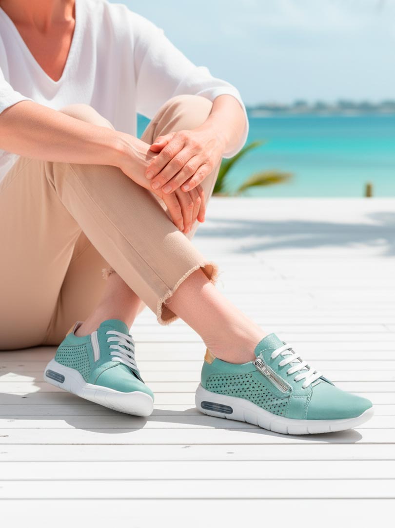 Cuero vacuno: Color pastel aqua con detalles metalizado champagne y calado que aportan frescura y un look sofisticado.