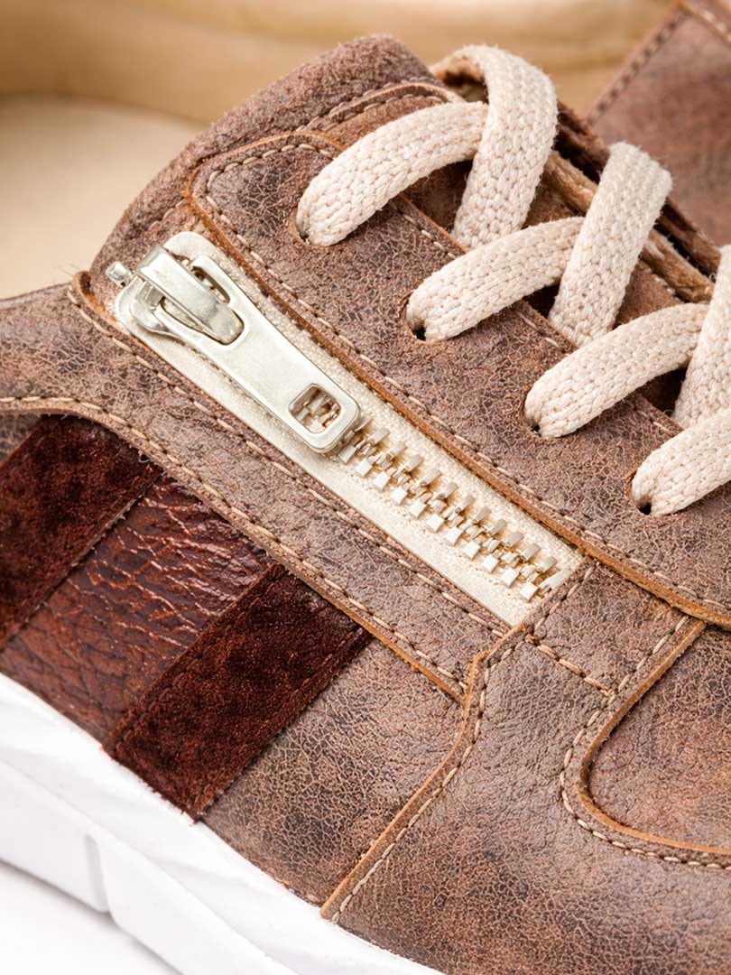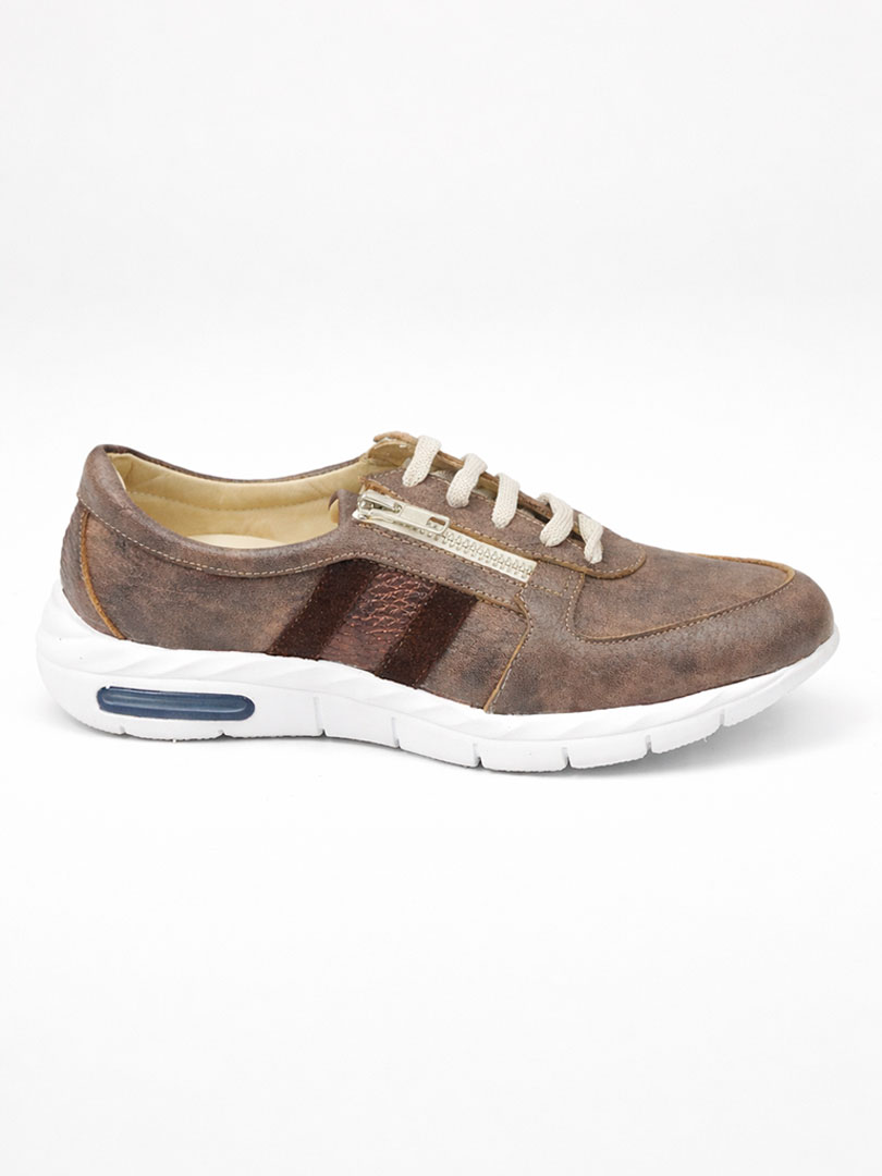 • Capellada en cuero vacuno: color marrón con detalle metalizado, blando, flexible y de gran durabilidad.