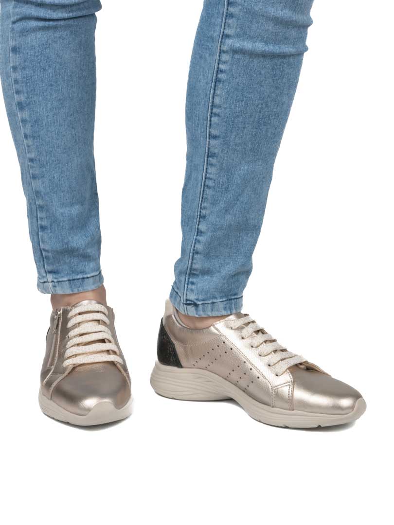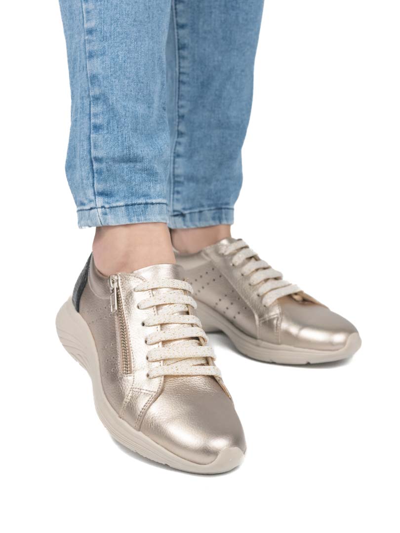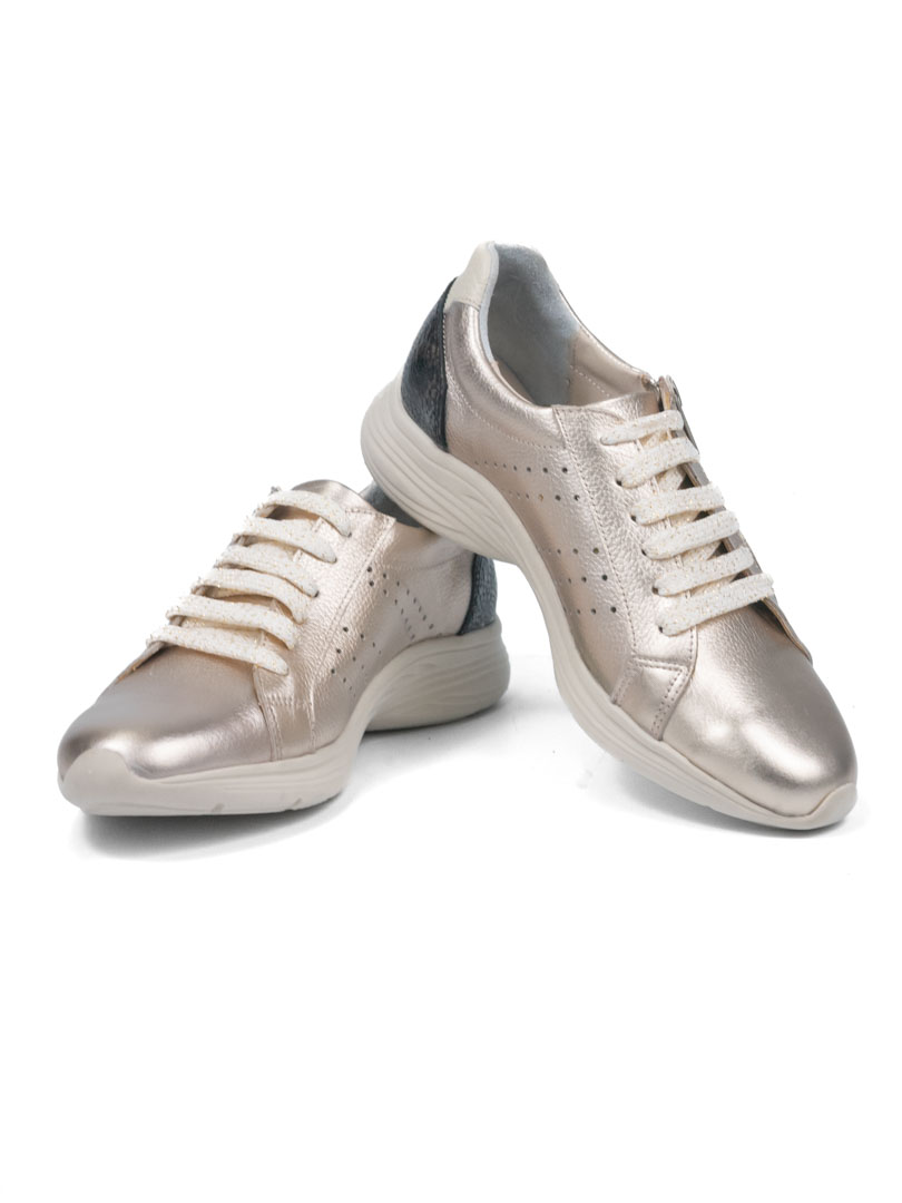Zapatillas marca Yanyk combinando cueros metalizado champagne con un grabado gotitas cobre y negro. Base liviana de 3.5 cm con excelente rebote. Posee un cierre lateral para calzarlas en un instante. Cordones beige on destellos metalizados. Un diseño juvenil para usar en todas ocasiones.