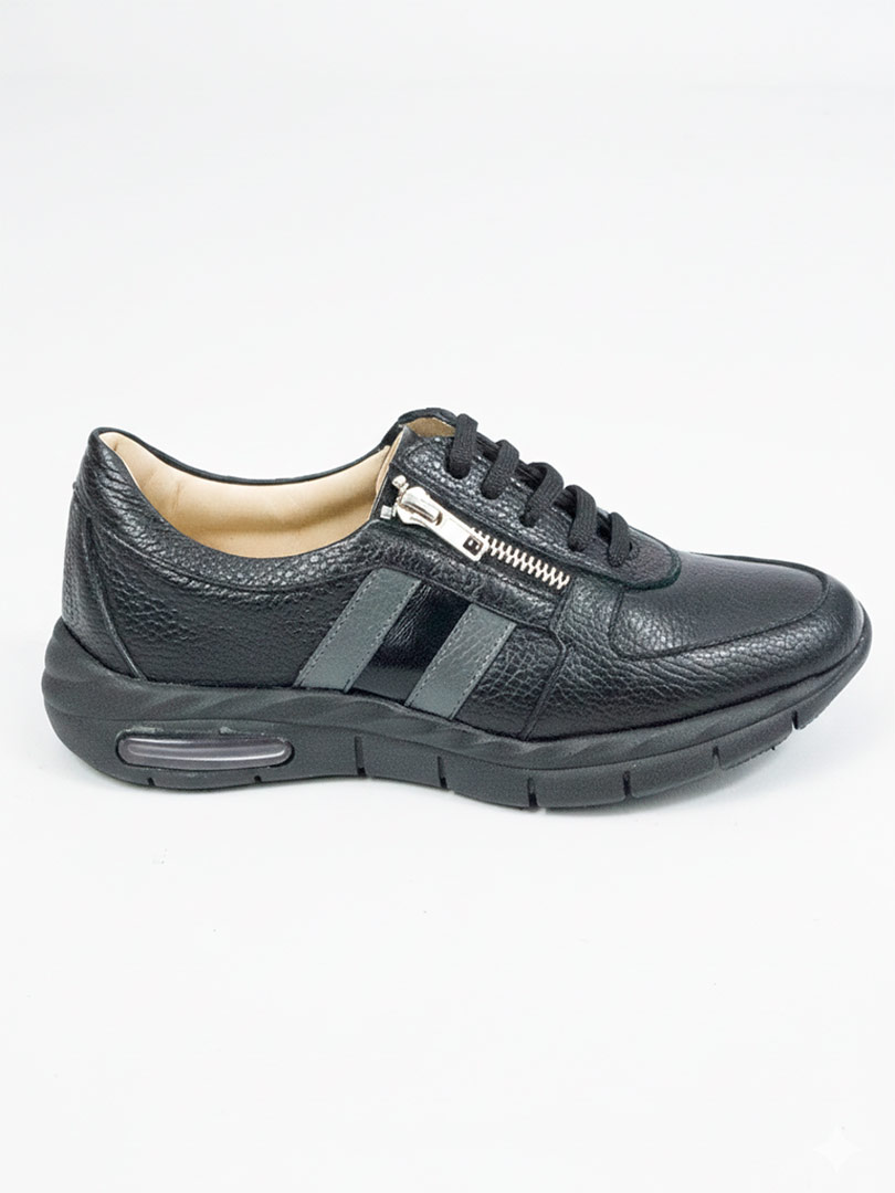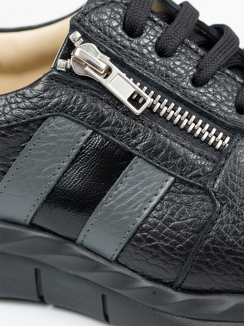 • Capellada en cuero vacuno: cuero flotter negro con detalles gris y charol. Blando, flexible y de gran durabilidad.