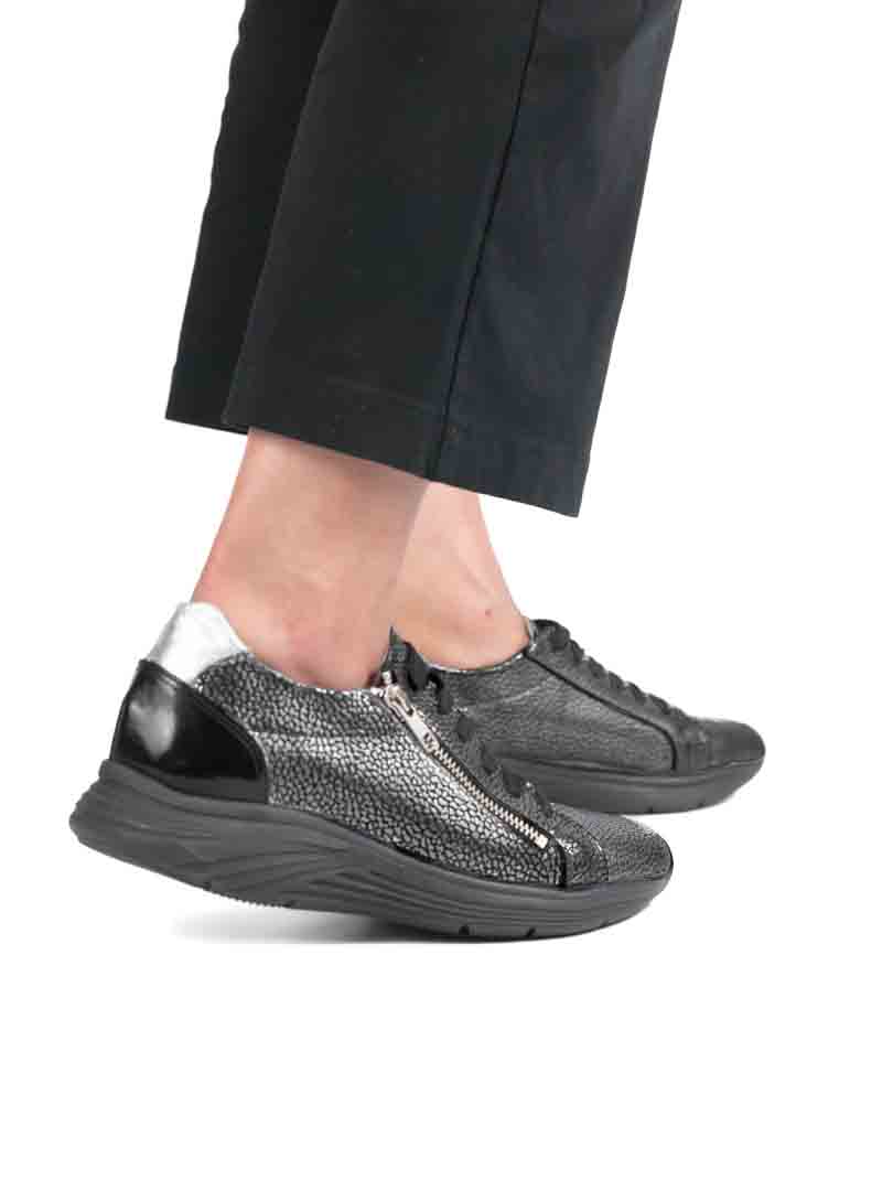 Zapatillas marca Yanyk combinando cuero flotter negro y peltre. Talón charolado con detalle plata.