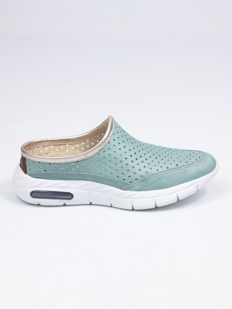 Cuero vacuno blando y resistente: color verde acqua con ribete metalizado champagne. Acabado suave al tacto, flexible y pensado para acompañar el movimiento natural del pie.